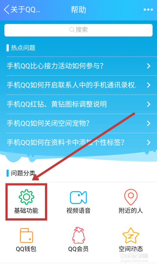 4、在“幫助”頁面中我們可以找到很多騰訊官方給出有關(guān)QQ的問題,這里我們需要點(diǎn)擊“基礎(chǔ)功能”,如圖所示。