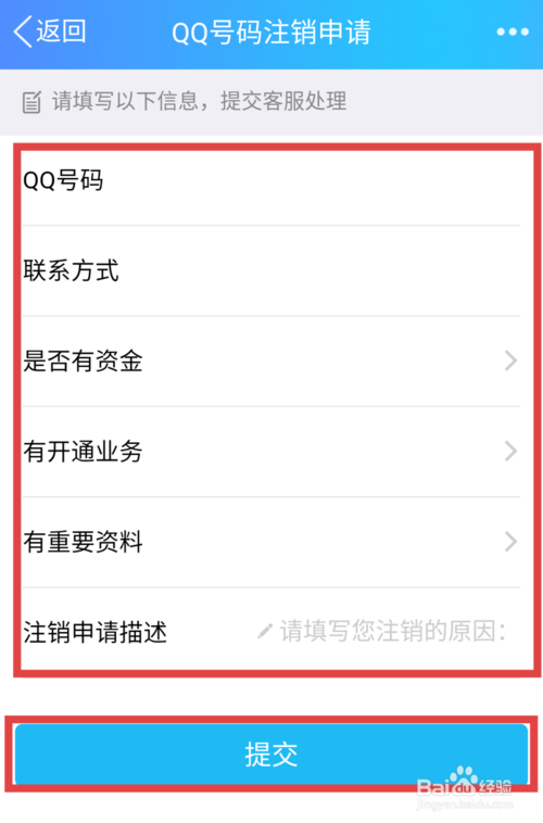 7、這里我們只需要將我們QQ的相關(guān)信息輸入進(jìn)去,然后點(diǎn)擊“提交”就可以了,稍微等待幾天騰訊客服通過了就可以完成注銷了