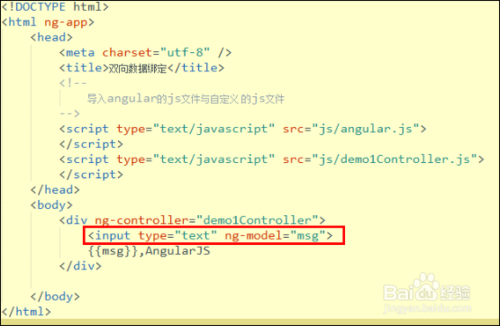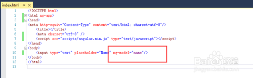 5.然后我們給上面添加的input輸入框添加一個(gè)ng-model屬性,如下所示,ng-model在angularjs中起到了數(shù)據(jù)雙向綁定的關(guān)鍵性作用