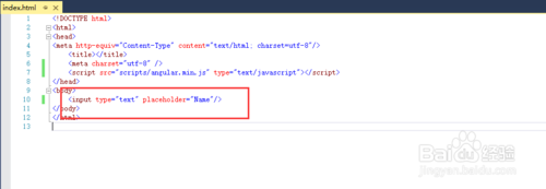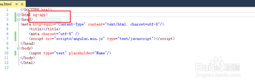 4.下面我們就要添加angularjs的內(nèi)容了,首先給頁面添加一個(gè)ng-app標(biāo)記,這個(gè)標(biāo)記標(biāo)識了從此標(biāo)記往下都是angularjs的領(lǐng)域了