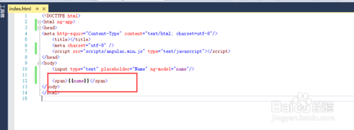 6.下面我們就是要輸出input里的內(nèi)容了,在Jquery中我們一般是先獲得input元素,然后獲取里面的值賦值給span,而在angularjs中都省略了,直接通過表達(dá)式語句{{}}輸出內(nèi)容即可