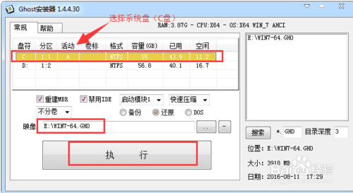 雙擊“硬盤安裝.EXE”,選擇“C盤”(C盤為系統(tǒng)磁盤),插入映像文件WIN7-64.GHO,接著點(diǎn)擊執(zhí)行