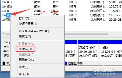 點(diǎn)擊選中(背景變成藍(lán)色)你要分的磁盤,右鍵,選擇“壓縮卷”。