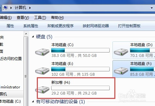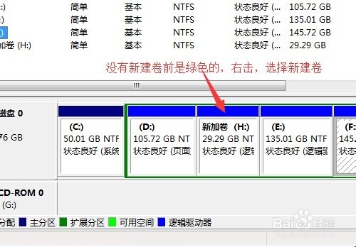 壓縮完之后會(huì)看到分區(qū)中多出一個(gè)區(qū)。(我的已經(jīng)新建過磁盤了,如果還沒操作,這個(gè)區(qū)是綠色標(biāo)志。(點(diǎn)擊選中該區(qū),點(diǎn)右鍵,選擇菜單中的第一項(xiàng)“新建卷...),然后格式為NTFS,其他都默認(rèn)就行。