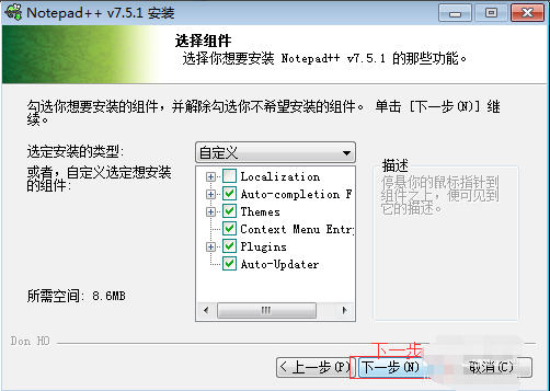 6、安裝路徑設(shè)置后會(huì)彈出如下截圖:在這里我們可以選擇安裝一些Notepad++的附加組件,如:Auto-updater自動(dòng)更新器,localization國(guó)產(chǎn)化、auto-completion自動(dòng)完成等。設(shè)置后單擊【下一步】繼續(xù)安裝。