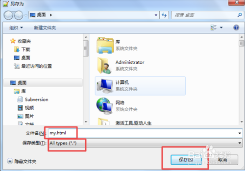 3.然后按下鍵盤的‘Ctrl+Alt+S’另存為,給它起個(gè)名字,要根據(jù)需要帶上具體的后綴名,如my.html,類型為All types(*.*),然后點(diǎn)擊 ‘保存’即可。