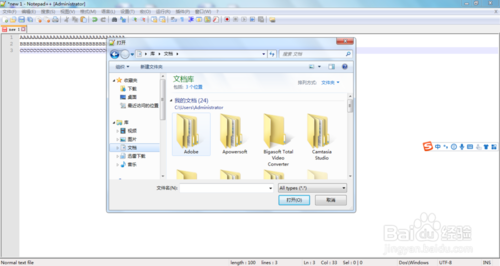 1.首先,用Notepad++打開(kāi)需要操作的文本。依次點(diǎn)擊菜單欄中的文件->打開(kāi)->選擇文件名,確定。如圖所示。