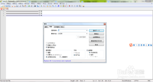 在查找模式中選擇正則表達(dá)式。點(diǎn)擊全部替換即可。
