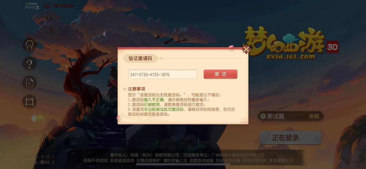 1、 進入游戲界面,登錄網(wǎng)易通行證,點擊屏【登錄游戲】按鈕,彈出驗證邀請碼窗口