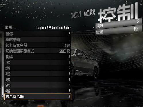 2. 這時我們再退回到游戲設(shè)置選項,選擇 "控制",此時注意屏幕右側(cè)的設(shè)置方案,將 "預(yù)設(shè)1" 調(diào)換為 "預(yù)設(shè)5" 即"Logitech G25 Combined Pedals"方案,這個方案是專門為羅技"G25_C-Pedals"控制設(shè)備使用的配套方案,該方案中已將所有默認鍵位及參數(shù)準確同步于此設(shè)備,方便玩家直接使用.而這個方案中才有離合器及指定切擋功能,我們接下來要做的就是更改這套方案的默認設(shè)置,把所有鍵位換為自己習(xí)慣的鍵位,通過套用這套方案,我們就可以實現(xiàn)自主離合器功能了.