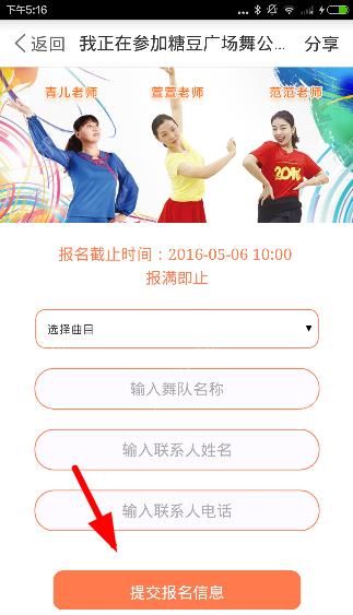 3、最后填寫相關信息,包括曲目、舞隊名稱、聯(lián)系人姓名、電話等,點擊“提交報名信息”就可以等待審核了。