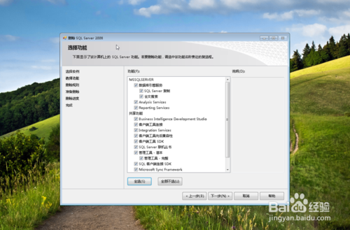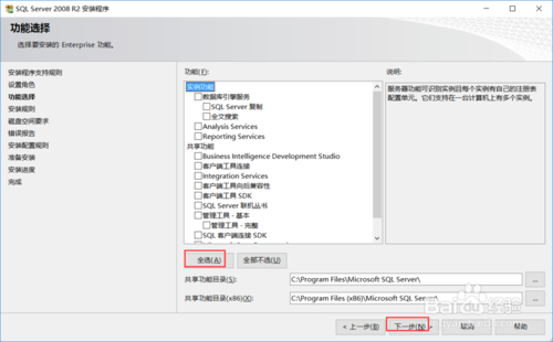 出現(xiàn)”選擇功能“對話框,這時一定要注意點選”全選“按鈕,一個一個點可以會有紕漏,再次安裝會提示錯誤。再選”下一步“按鈕。