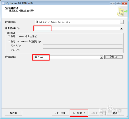 選擇服務(wù)器名稱為local,例子中是'.',數(shù)據(jù)庫為DB_Test。實際中以真實數(shù)據(jù)庫為主,以上只是演示實例,之后點擊下一步。