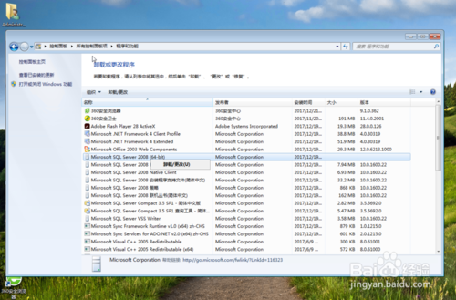 還沒有完,我們再回到”卸載或更改程序“里面,刪除以Microsoft SQLServer 2008開頭的程序,一般情況下只有兩個,還是右鍵選擇刪除,很快就刪除掉了。