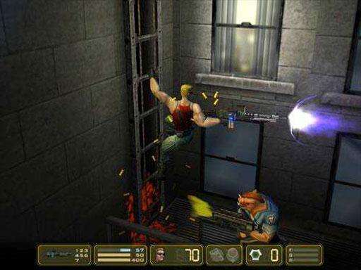 到第二個(gè)場(chǎng)景后,跳上平臺(tái),爬上鐵塔,兩級(jí)跳跳到屋頂,得到double damage,下來跳到前面的樓上,這里小心,有飛行機(jī)械(激光攻擊,還會(huì)特么的會(huì)自爆!還好智商偏低,帶著他跑)繼續(xù)往前走,干掉三豬頭,跳上正在吹風(fēng)的吹風(fēng)機(jī),撿到50發(fā)子彈,跳到前面的樓上。順梯子下去,有幾個(gè)豬頭,走到門旁會(huì)提示門是鎖著的。爬上梯子跳到左邊的類似空調(diào)的箱子上,往左走,不用我說了,大腳踢開破墻,找到secret place 4,和第六個(gè)nuke,返回門前,往右走,跳到正在工作的吹風(fēng)機(jī)上,撿到第七個(gè)nuke,落到最高層的鐵架上,干掉豬頭,往右跳,撿到shotgun,然后見看到,人質(zhì)和開關(guān),解救“美女”,得到20生命,打開開關(guān),剛才鎖著的門打開了。跳下來,看到黃色的電子門,現(xiàn)在沒有鑰匙,干掉幾個(gè)豬頭后,往左走,在下層,打爆鐵桶,解決一個(gè)豬頭后,找到secret place 5,和第八個(gè)nuke,然后利用吹風(fēng)機(jī)回到左邊,進(jìn)門。