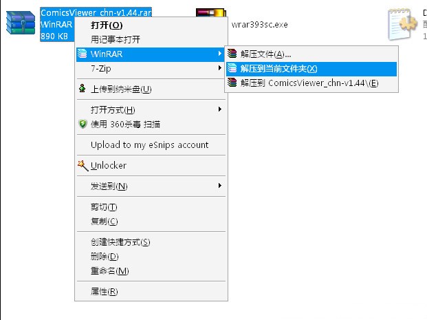 1.首先,把你下載下來的壓縮包 ComicsViewer_chn-v1.44.rar 放到你想放軟件的地方,然后 右鍵 -> WinRAR —> 解壓到當前文件夾如圖: