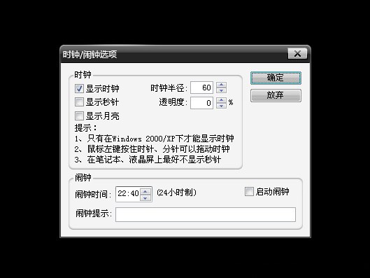時鐘的秒針每秒重畫一次,在筆記本、液晶屏上,頻繁的重畫理論上說會對液晶屏的壽命造成影響,因此建議關(guān)閉秒針顯示。另外為了減輕定時器對CPU時間的消耗,將鬧鐘精度定為正負10秒,聽起來似乎不是很準,不過應(yīng)該夠用了。
