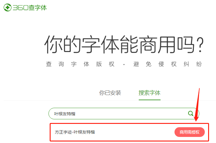 如檢測的字體右方出現(xiàn)“商用需授權(quán)”,用戶需聯(lián)系字體方授權(quán)再使用,以防出現(xiàn)侵權(quán)賠付的問題。