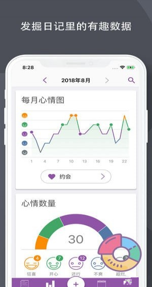 * 多樣的數(shù)據(jù)統(tǒng)計在Daylio情緒追蹤app中,你可以查看到以折線圖形式呈現(xiàn)的每月心情,以及各個情緒的出現(xiàn)頻率,幫助你找到生活不快的癥結(jié),探尋快樂源泉,更了解自己,更好地進行情緒管理。