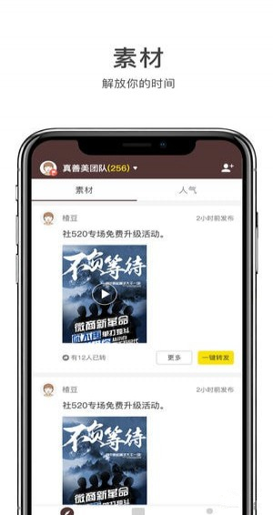 - 團(tuán)隊(duì)成員能夠:1、一鍵轉(zhuǎn)發(fā)素材至朋友圈;