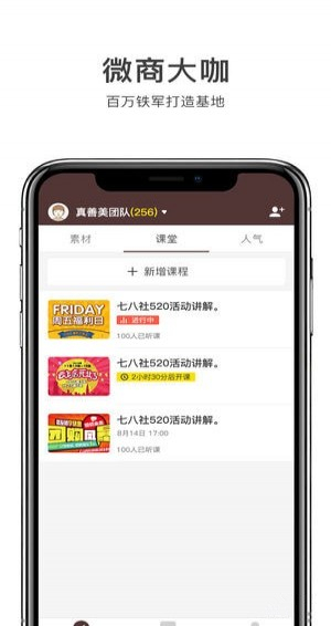 【素材一鍵轉(zhuǎn)發(fā)】大咖可以隨時(shí)添加素材到團(tuán)隊(duì)的素材庫(kù),成員可以一鍵轉(zhuǎn)發(fā)素材;大咖還可以通過(guò)微商云管家app一鍵提醒功能提醒團(tuán)員,通知素材及課程發(fā)布等團(tuán)隊(duì)最新動(dòng)態(tài);【專(zhuān)業(yè)微商課堂】一個(gè)專(zhuān)屬于微商團(tuán)隊(duì)的課堂培訓(xùn)功能,界面清晰直觀,更符合微商團(tuán)隊(duì)展開(kāi)培訓(xùn)的需求。