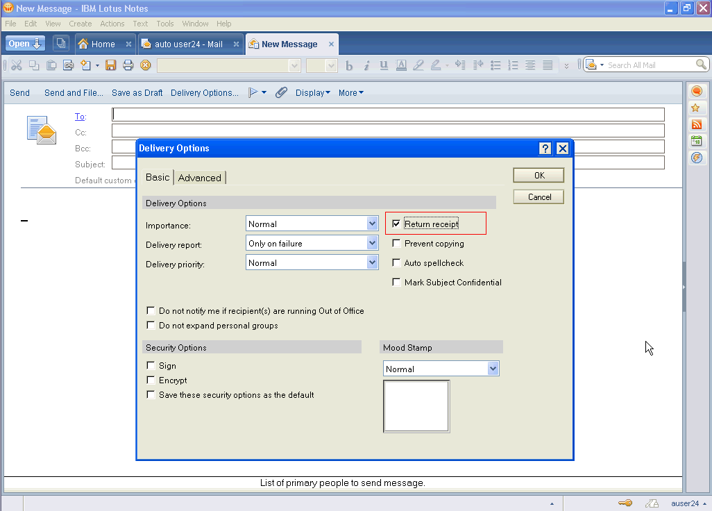 如果對(duì)某些重要郵件,您很想確認(rèn)對(duì)方是否收到郵件。可以在新建一封郵件的時(shí)候,點(diǎn)擊"Delivery Options",在這里勾上"Return receipt"。這樣如果對(duì)方收了郵件,您就可以收到一封回執(zhí)。