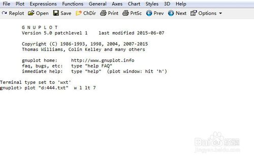 3、打開gnuplot程序,輸入指令:plot "d:444.txt"其余的都默認系統(tǒng)設(shè)置,按回車鍵。