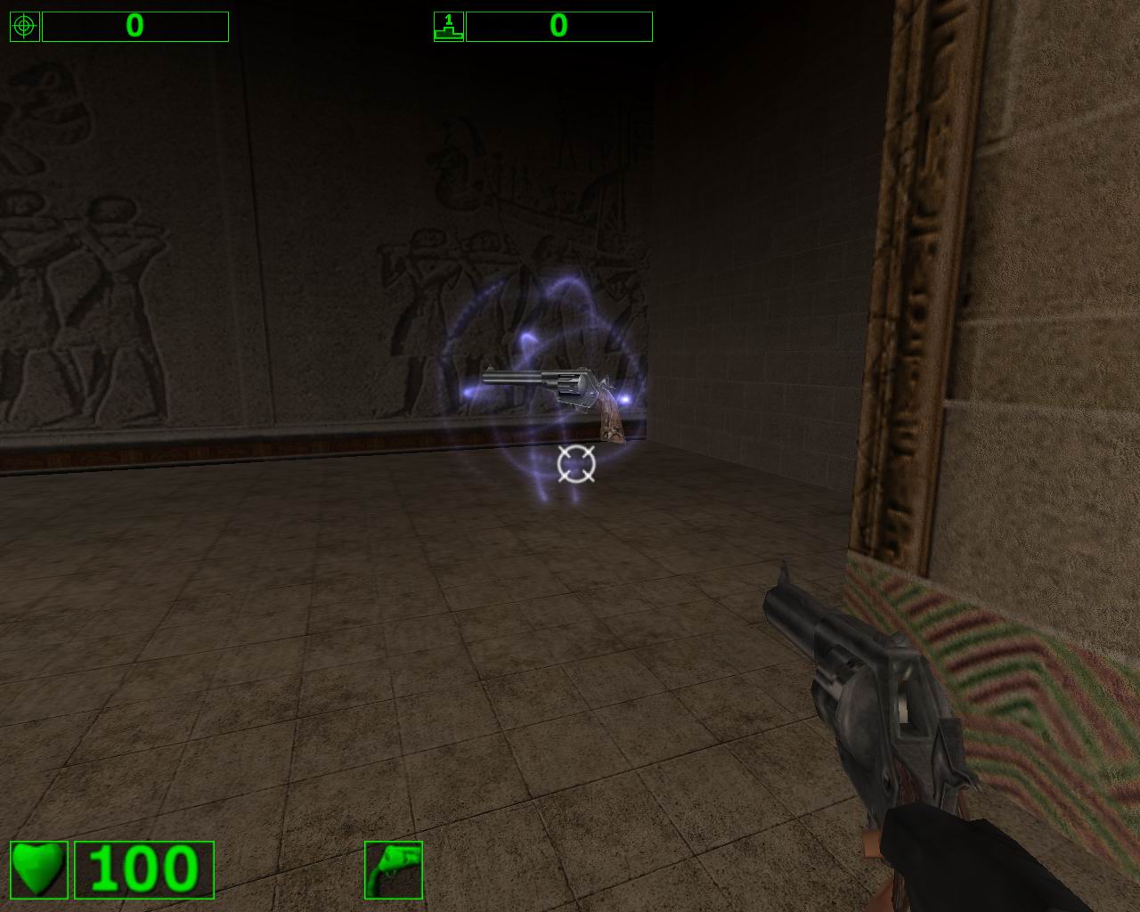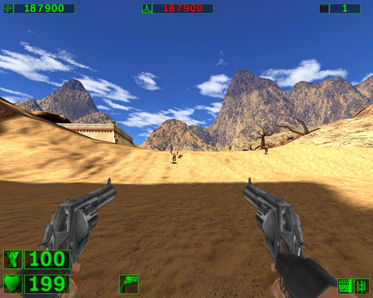 在附近有一把左輪手槍,獲得后就可以變成雙槍了。(這個也是本關(guān)的隱藏點之一)
