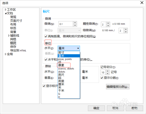 4.找到文檔→標(biāo)尺→單位,選擇需要的標(biāo)尺px,點擊完成