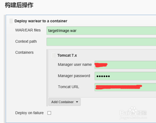 7.構(gòu)建后操作,使用插件發(fā)布項(xiàng)目,進(jìn)行項(xiàng)目的發(fā)布,項(xiàng)目發(fā)布需要使用的插件是(Deploy to container Plugin),發(fā)布到tomcat中,所有需要用到的工具都可以在需www.linuxprobe.com/tools頁(yè)面下載到。要用到tomcat的用戶名和密碼,tomcat用戶可以自己在tomcat中的conf/tomcat-users.xml文件中配置