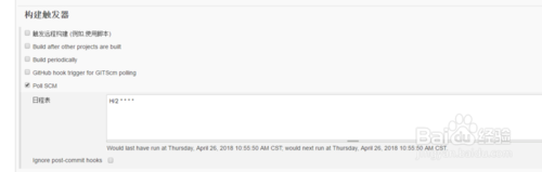 8.構(gòu)建觸發(fā)器,jenkins提供定時(shí)構(gòu)建及輪詢(xún)機(jī)制。輪詢(xún)是設(shè)置一段時(shí)間間隔,去代碼倉(cāng)庫(kù)檢測(cè)是否有更新,有更新觸發(fā)構(gòu)建,如下圖所示: