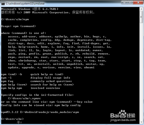 需要配置path,加入如:E:\Android\Python27;C:\Users\che\AppData\Roaming\npm;