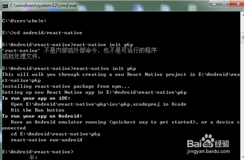 cd選擇你想要存放項目的目錄下,執(zhí)行:react-native init cheProject(項目名稱),回車。這個過程比較慢,至少10分鐘以上。當出現(xiàn)以下畫面,恭喜您。