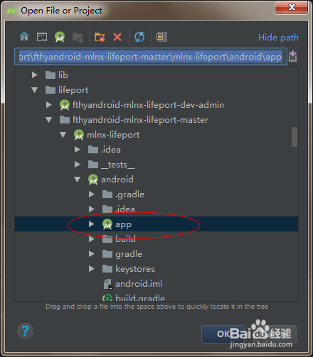 需要特別注意的是這一步,犯了幾次錯,一定要選擇這個Android項目下的app,用這個作為根目錄