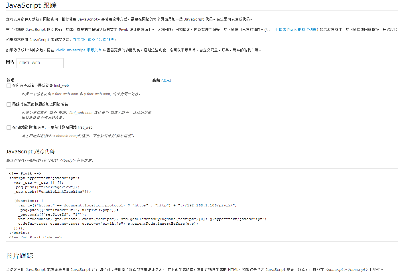 剛裝好的Piwik是空空如也的,此時(shí)我們需要這個(gè)系統(tǒng)幫我們統(tǒng)計(jì)數(shù)據(jù)。目前Piwik支持兩種采集用戶訪問(wèn)記錄的方式: JS追蹤和訪問(wèn)日志追蹤。JS追蹤可定制型高,可以獲取到用戶的分辨率,瀏覽器插件等等,還可以捕獲自定義變量。訪問(wèn)日志追蹤(如apache的accesslog)可以追蹤到用戶的錯(cuò)誤請(qǐng)求(如40X錯(cuò)誤,有助于捕獲到惡意用戶和爬蟲(chóng),蜘蛛等等),目前這兩種追蹤得到的數(shù)據(jù)還不支持合并。JS追蹤