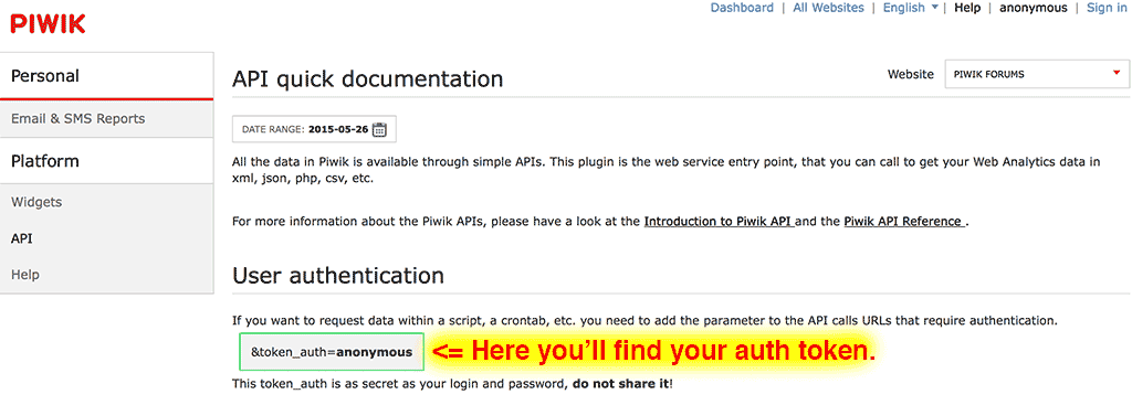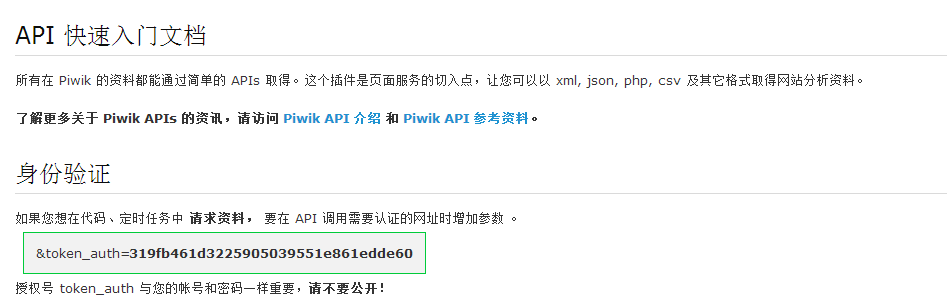 --token-auth這個(gè)參數(shù)是管理員的訪問(wèn)token,在系統(tǒng)頁(yè)面最頂上的API點(diǎn)開(kāi)即可看到,如下圖所示。這個(gè)參數(shù)可以使用--login=LOGIN --password=PASSWORD這兩個(gè)參數(shù)替代,必須是管理員的賬戶和密碼。