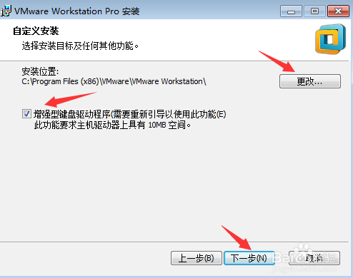 在彈出的“自定義安裝”窗口中,可以點擊“更改”按鈕選擇VMware Workstation的安裝目錄(本教程中采用默認目錄)。選定安裝位置后,勾選“增強型鍵盤驅(qū)動程序”,然后點擊“下一步”按鈕進入下一步;