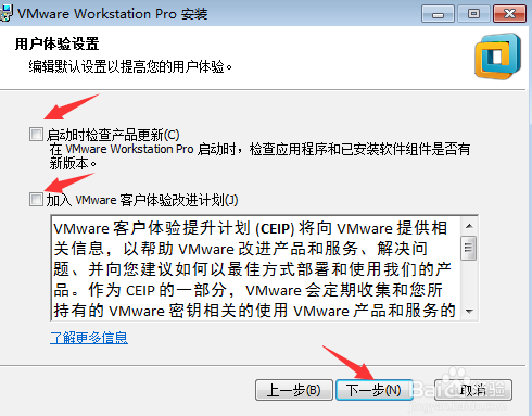 在彈出的“用戶體驗設置”窗口中,去掉“啟動時檢查產(chǎn)品更新”和“幫助完善VMware Workstation Pro(H)”復選框前的勾,然后點擊“下一步”按鈕進入下一步;