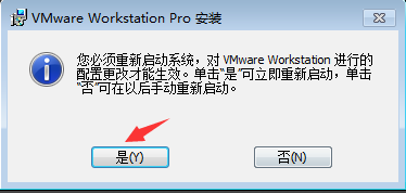 在彈出的“系統(tǒng)重啟提示”窗口中,點擊“是”按鈕重啟系統(tǒng)(這里也可以點擊“否”按鈕,等激活VMware Workstation 14 Pro后再重啟。