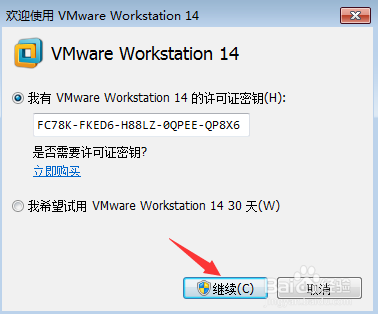 雙擊桌面上的“VMware Workstation Pro”圖標,在彈出的“VMware Workstation 14激活”窗口中,輸入許可證“YC592-8VF55-M81AZ-FWW5T-WVRV0”(解壓VMware-workstation-full-14.0.0目錄下的Crack.zip,打開解壓后的_keys.txt,可以見到所有可用的許可證),然后點擊“繼續(xù)”按鈕請求激活;