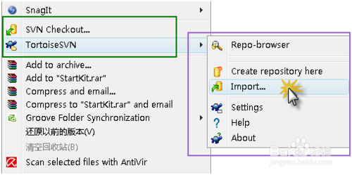 1.首先在你SVN項(xiàng)目所在文件夾右鍵,找到TortoiseSVN,然后選擇里面的“Setting”,如圖所示。