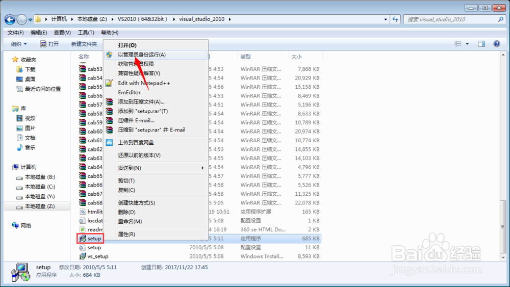 打開“VS2010(64&32bit)\visual_studio_2010”文件夾,鼠標(biāo)右擊“setup”,選擇“以管理員身份運(yùn)行”