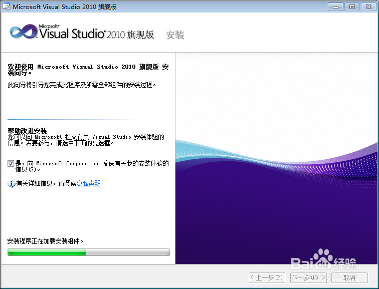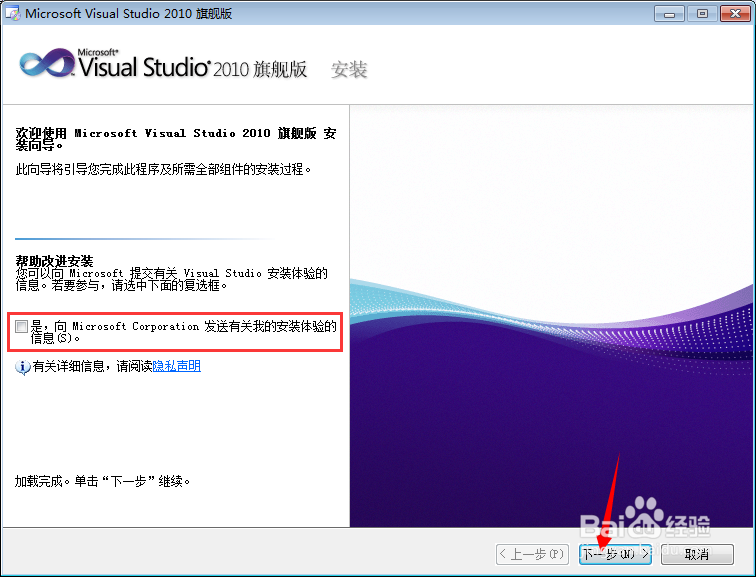 將“是,向 Microsoft Corporation 發(fā)送有關(guān)...”前面復(fù)選框的勾去掉,然后點擊“下一步”