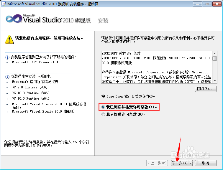選擇“我已閱讀并接受許可條款”,然后點擊“下一步”
