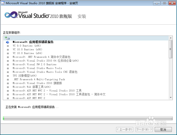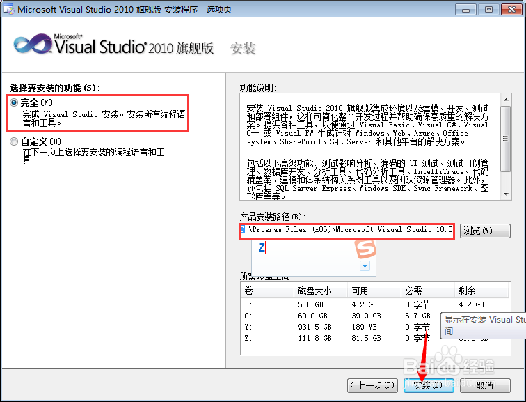 選擇“完全”;再選擇安裝路徑,默認(rèn)安裝在 C:\Program Files (x86)\Microsoft Visual Studio 10.0(建議安裝在除C盤以外的磁盤上,可以直接將C改成Z,安裝到Z盤),最后點擊“安裝”