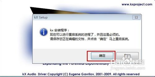 4、【聲卡驅動的安裝】雙擊打開“KX-3550主驅動.exe”(圖第一張)根據(jù)圖片所示(圖第2張到13張)依次操作。(下第14張圖)點擊后電腦就會自動重啟,如果電腦沒有自動重啟,請手動關機一下,在重新開機開機。