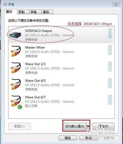 7、打開后選擇“SPDIF/AC3Output”然后點設置“設為默認值”(如圖所示)