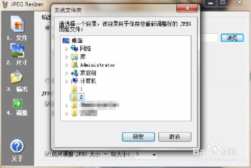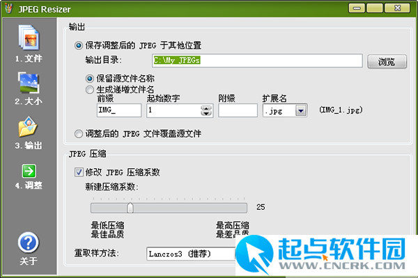 第三步:下載完成之后,雙擊JPEG Resizer.exe運行軟件。首先進行輸出設(shè)置,點擊左邊菜單欄中的“3.輸出”,在右邊窗口中可以設(shè)置調(diào)整后的圖片文件輸出路徑,單擊“瀏覽”,選擇想要保存圖片的文件夾,確定即可。也可以選擇調(diào)整后覆蓋源文件。這里還可以調(diào)整JPEG壓縮系數(shù),這里一般設(shè)置為1調(diào)整出來的圖片最清晰。