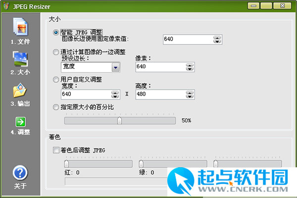 修改圖片大小的方式分為:智能調(diào)整,通過計算圖像的一邊調(diào)整,用戶自定義調(diào)整和指定原大小的百分比進行調(diào)整,JPEG Resizer還可以對目標圖片進行自定義著色處理,如下圖所示: