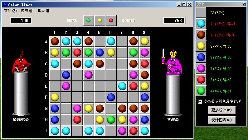 winlinez五連球是一款經(jīng)典好玩的類(lèi)似五子棋的游戲。游戲有一定的難度,你要做的就是移動(dòng)棋盤(pán)上的小球,使最少5個(gè)同顏色的小球連成一條水平線、一條垂直線或一條45度斜線,當(dāng)連成線時(shí),著些小球就會(huì)消除,而你也就會(huì)的到相應(yīng)的分?jǐn)?shù),直到小球充滿整個(gè)棋盤(pán)時(shí),winlinez五連球游戲結(jié)束。小球還可以選擇以圖形方式顯示!